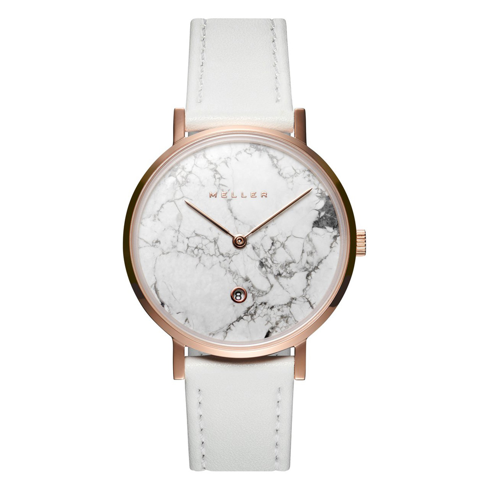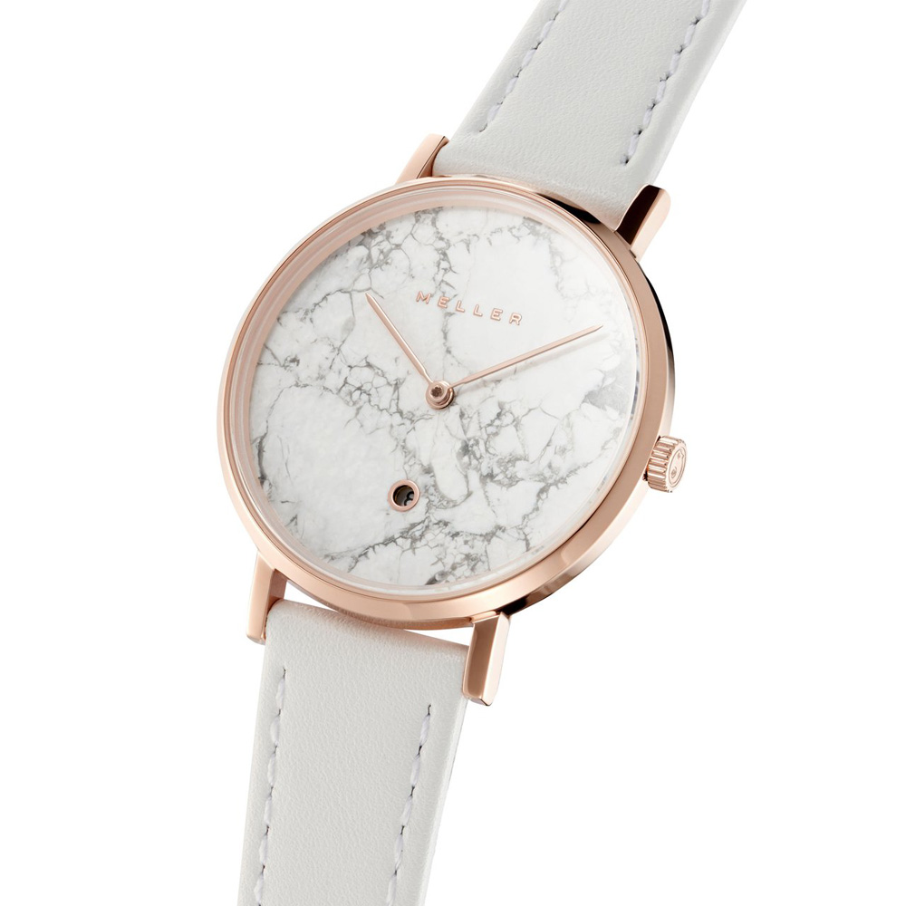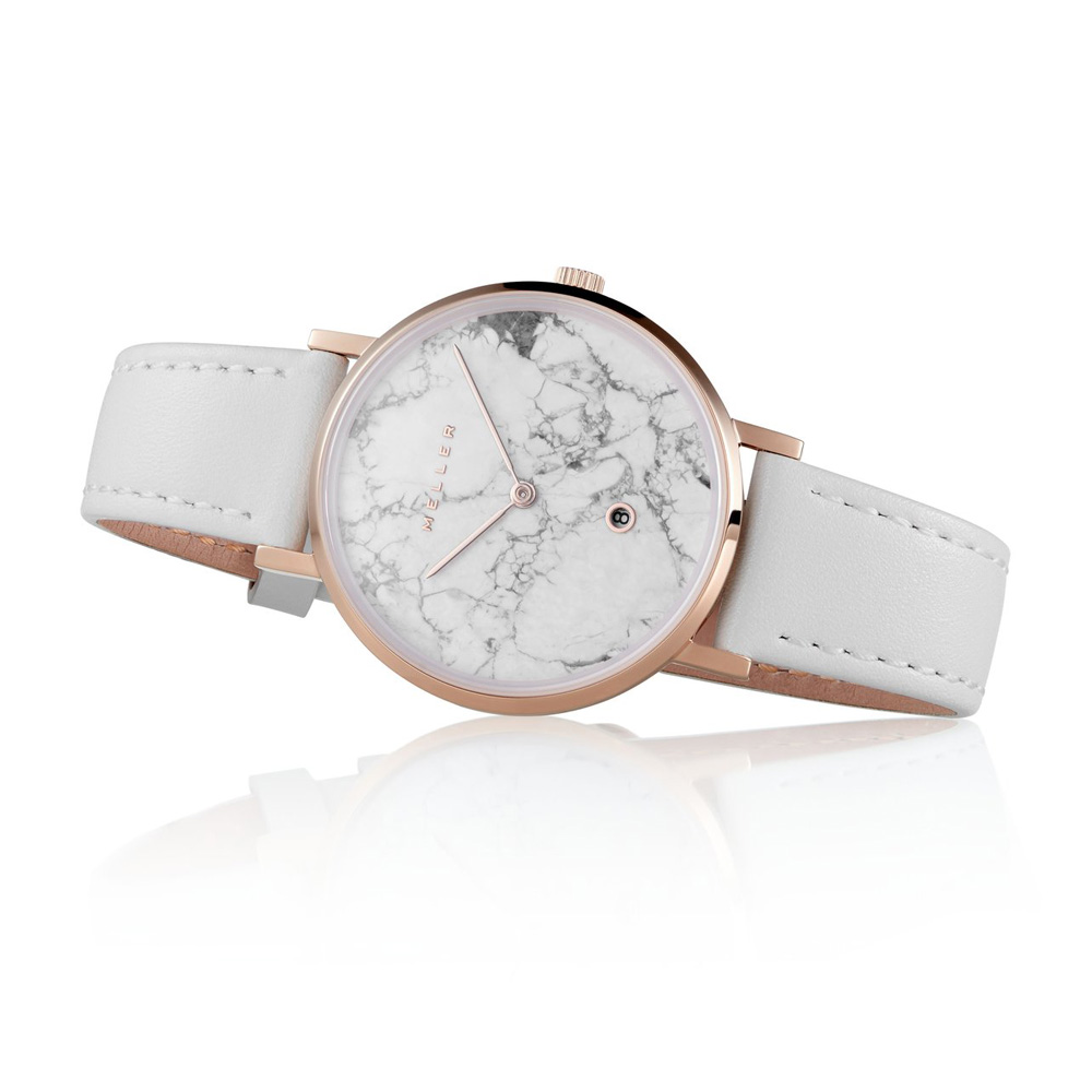 Το Meller Astar Dag Marble με κωδικό W1R‑1WHITE είναι ένα σύγχρονο ρολόι γυναικείο που συνδυάζει minimal design και διαχρονική κομψότητα. Η κάσα 34 mm σε χρώμα ροζ χρυσό (PVD επιχρύσωση), σε συνδυασμό με την λευκή, μαρμάρινη (dag marble) καντράν, δημιουργούν ένα αποτέλεσμα μοναδικής αισθητικής, όπου κάθε ρολόι έχει ξεχωριστό pattern.