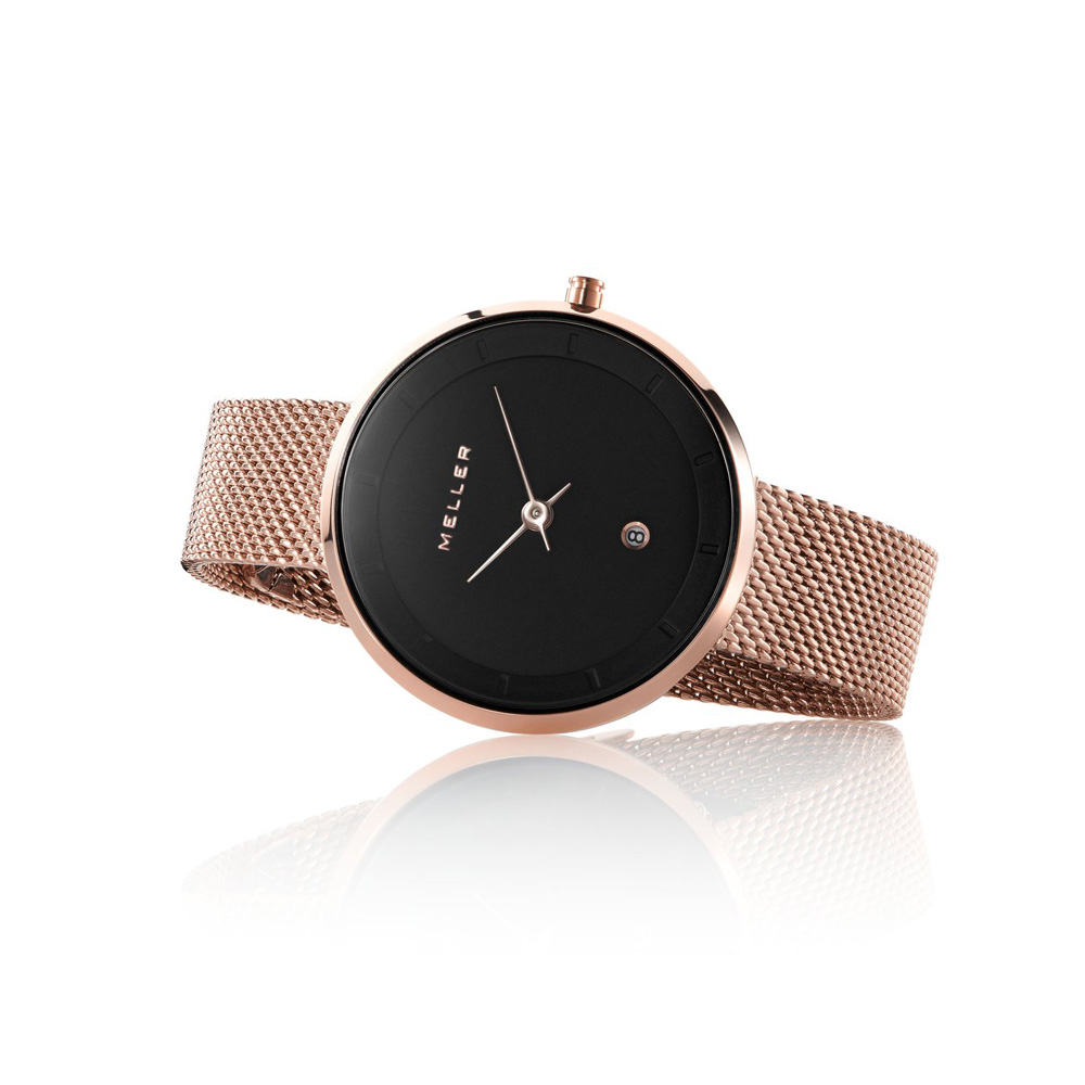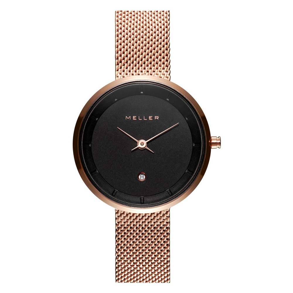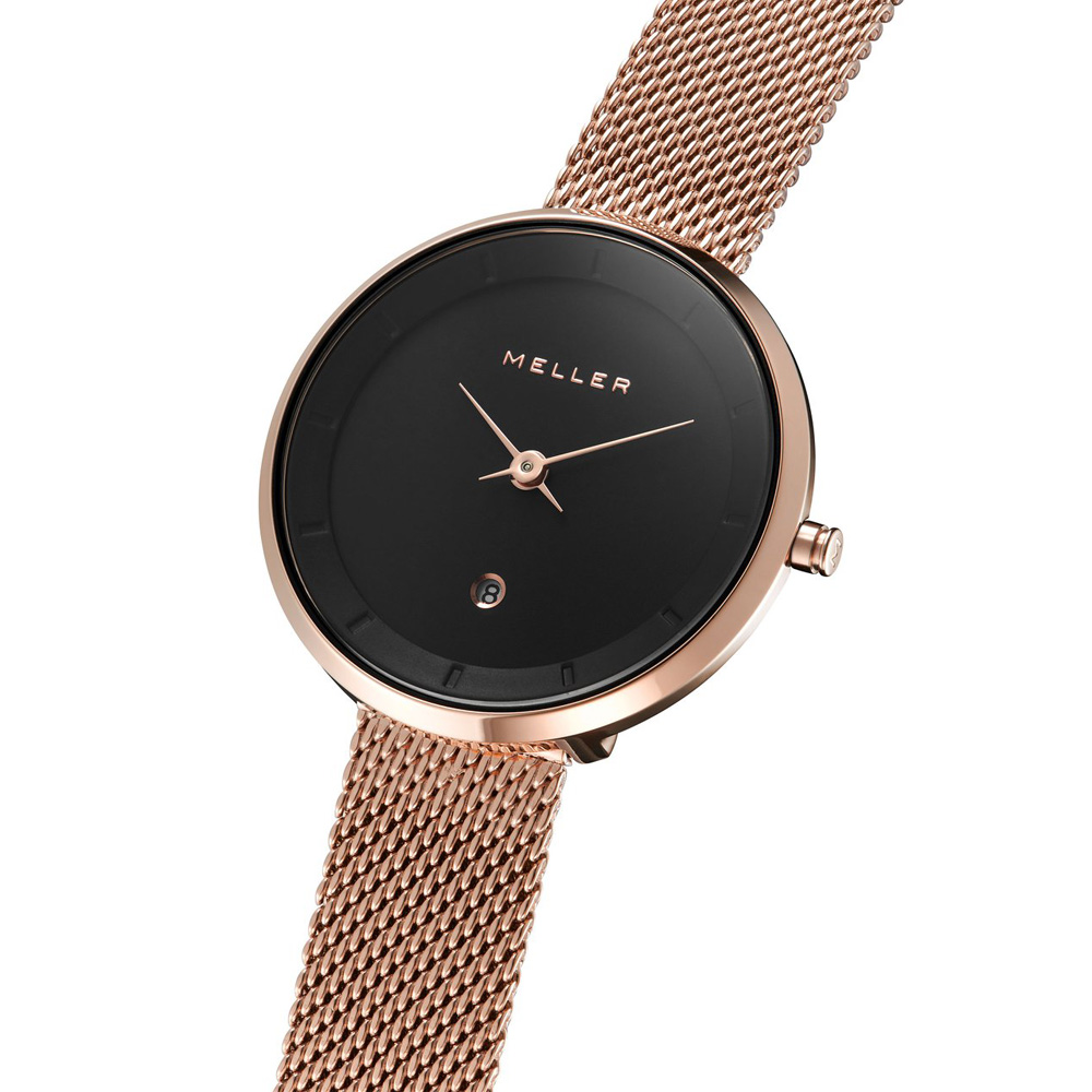 Το Meller Niara Baki Roos – W5RN-2ROSE απευθύνεται σε γυναίκες που αναζητούν κομψότητα με αίσθηση minimal. Με μικρή κάσα 34 mm σε ροζ χρυσή απόχρωση από ανοξείδωτο ατσάλι και υπέροχη mesh μπρασελέ στο ίδιο χρώμα προσφέρει μοντέρνα εμφάνιση. Η κάσα είναι μόλις 6 mm λεπτή, ιδανικά διαμορφωμένη ώστε να κάθεται άνετα στον καρπό χωρίς υπερβολές. Το καντράν σε μαύρο χρώμα προσθέτει αντίθεση, ενώ οι ροζ χρυσές λεπτομέρειες και το μικρό παράθυρο ημερομηνίας στη θέση 6 δημιουργούν ισορροπημένη αισθητική με μινιμαλιστικό χαρακτήρα.